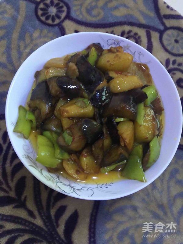 鍋里放適量油,將茄子和土豆炸一下,茄子體積變小,土豆變黃即可,尖椒也略炸一下