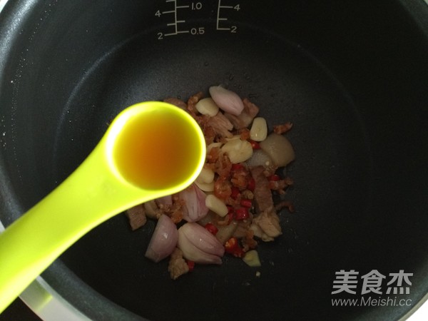 5.加入海米、大蒜片、紅蔥頭和辣椒段,翻炒出香味之后,加入黃酒去肉腥味;