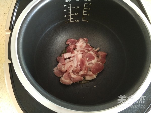 4.內膽加熱之后,打開鍋蓋,放適量食用油,再將豬瘦肉片放入鍋內,翻炒直至變色;