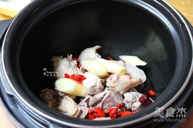 把雞塊、香菇、枸杞、紅棗、生姜放入壓力鍋中