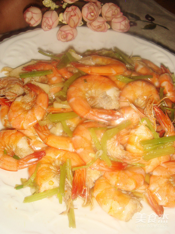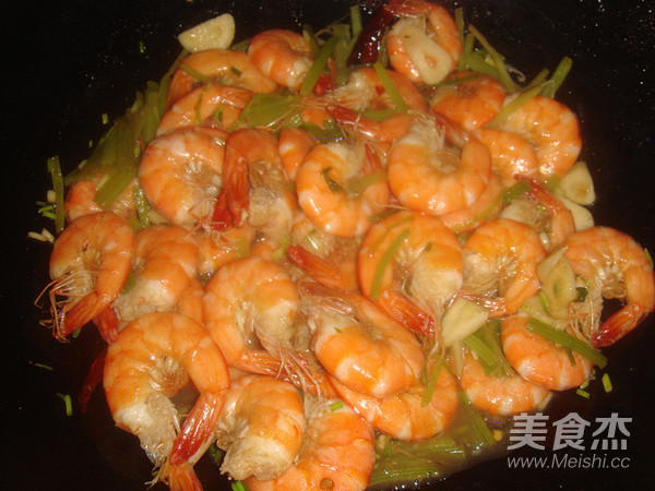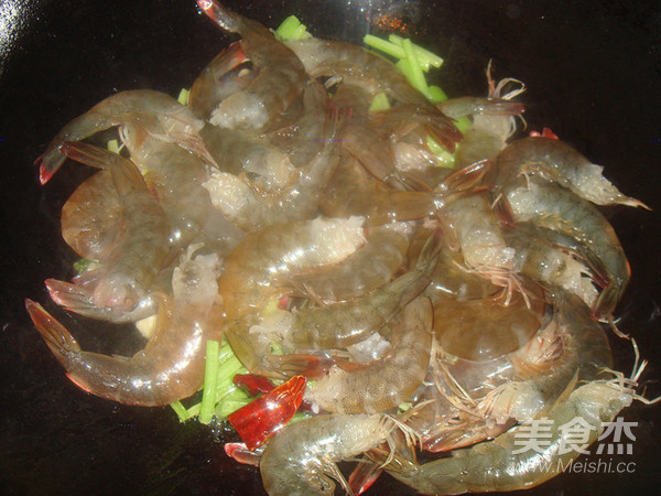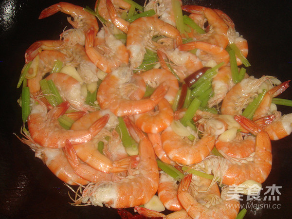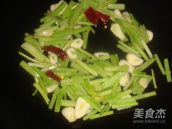起油鍋先倒入芹菜、大蒜和辣椒翻炒至五分熟