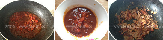 5.干凈鍋,少油,先炒肥牛片,變色后加珍珠菇和之前炒好的番茄醬翻炒