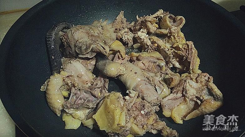 鍋熱,小火煎雞油,倒入雞塊,大火炒干水份;