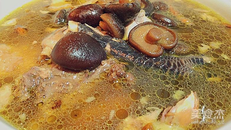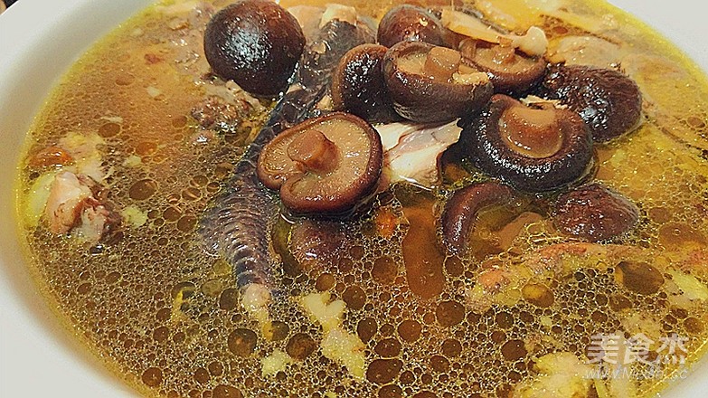 倒入燉鍋,放淘洗后擠干水份的香菇(泡發香菇的水同時倒入),放老姜顆、胡椒粒,燉兩小時;
