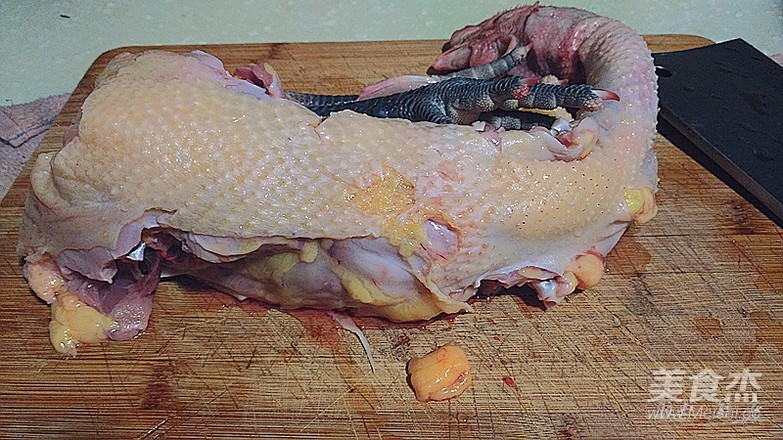 土雞架(雞脯、腿、翅另用),撕下大塊的雞油,宰大塊。