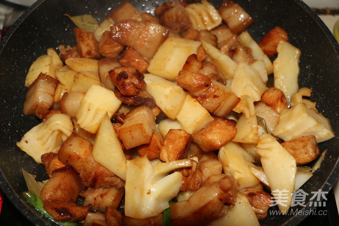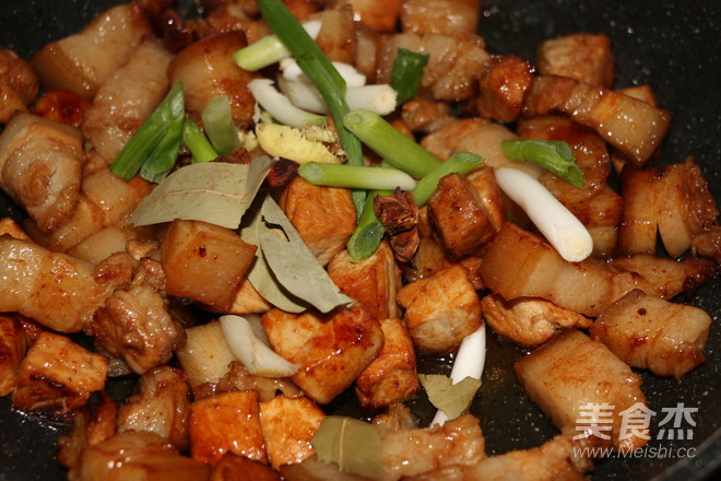 加入蔥姜、大料、香葉、桂皮等調料繼續翻炒。