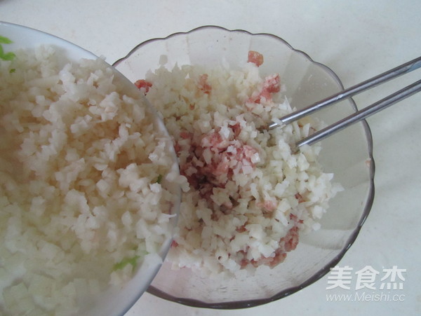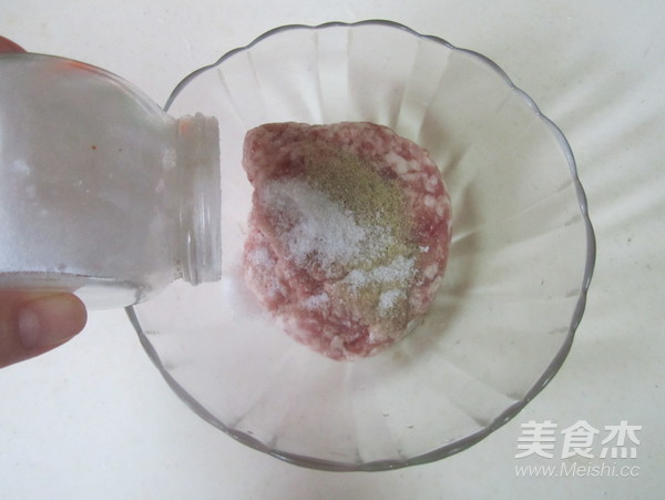 肉餡中加入點鹽、生姜粉、胡椒粉和料酒等調味料, 順著一個方向攪拌上勁;