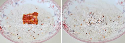 7.然后把糯米粉、辣椒碎、花椒碎攙和在一起,倒入腌制好的排骨,裹上薄薄一層米粉,土豆同上做法