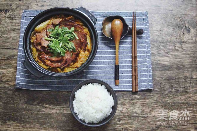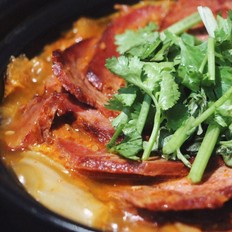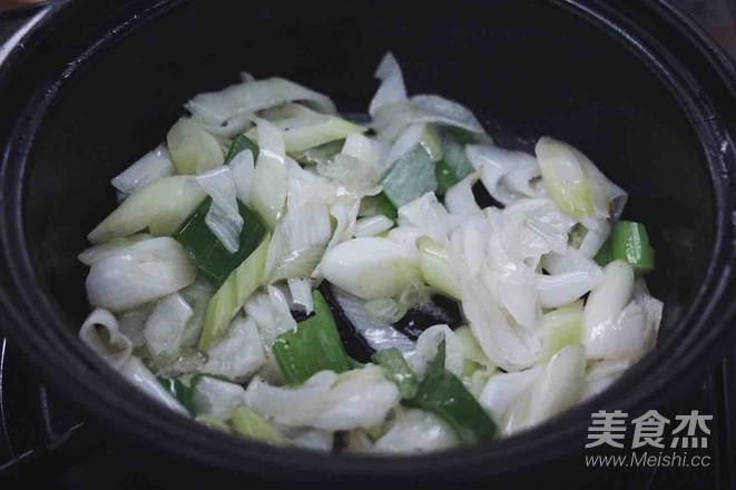 砂鍋熱油,大蔥切碎放進鍋內炒香