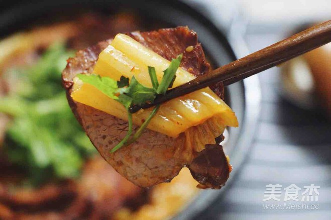 水開后,放入切好的鹵牛肉,加入2勺食醋、1勺生抽、1點鹽。