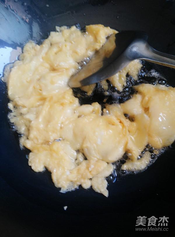 熱鍋倒油燒開,倒入蛋液煎至兩面金黃后劃散,盛出