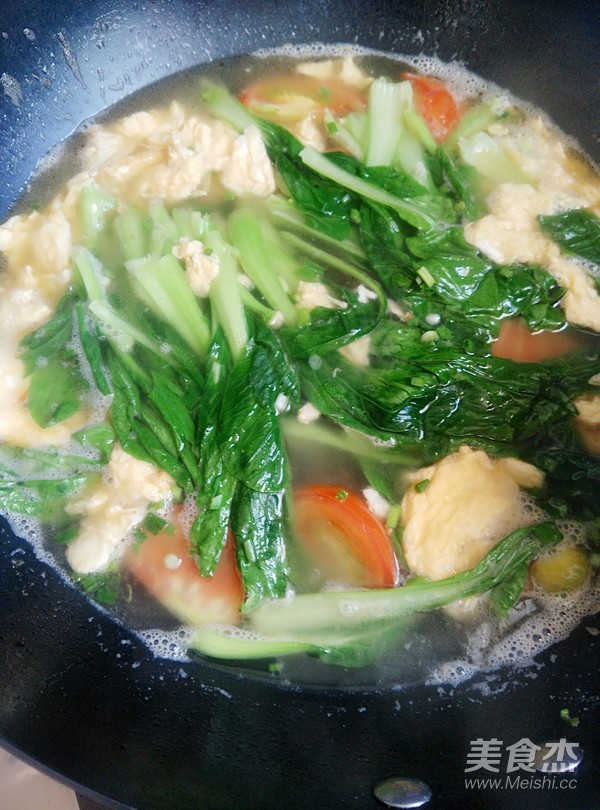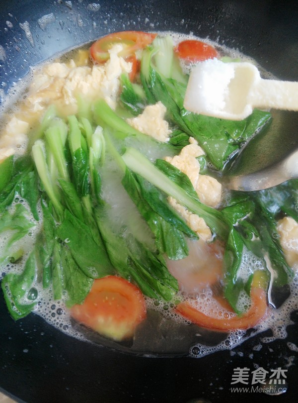 放入雞蛋和小白菜煮至斷生