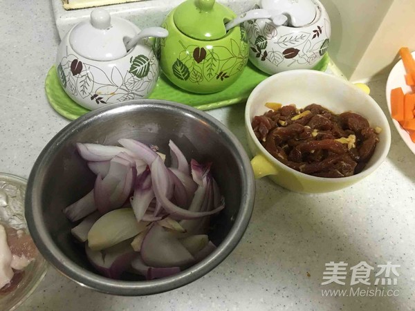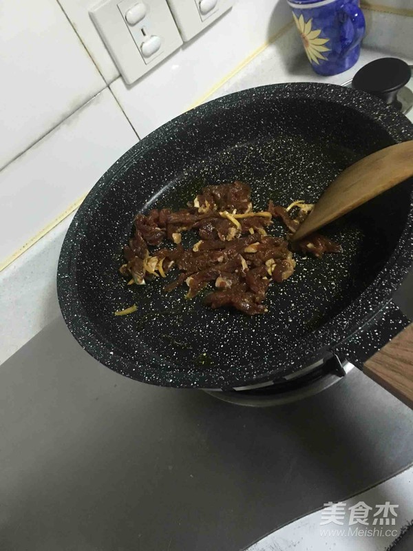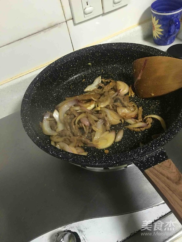 10.起油鍋倒入腌好的牛肉翻炒一分鐘后加入洋蔥。