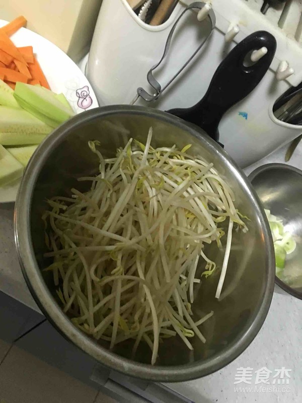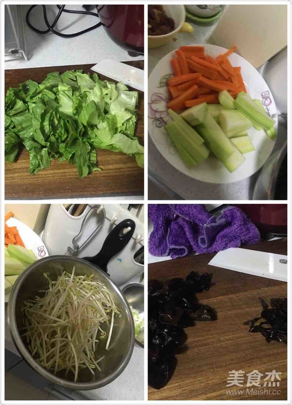 7.生菜切絲,西葫蘆和胡蘿卜切條狀,豆芽控干水,木耳切絲。