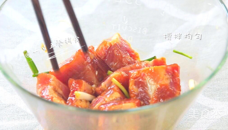 3.排骨放碗中,加2勺生抽,1勺油,蔥,姜攪勻。