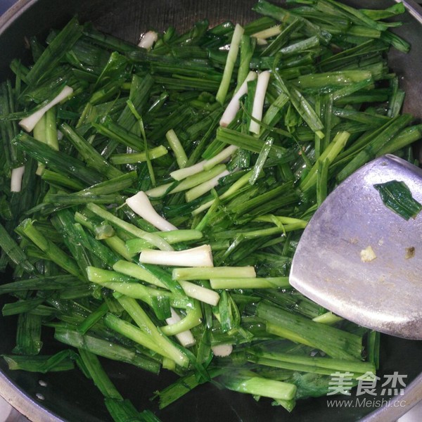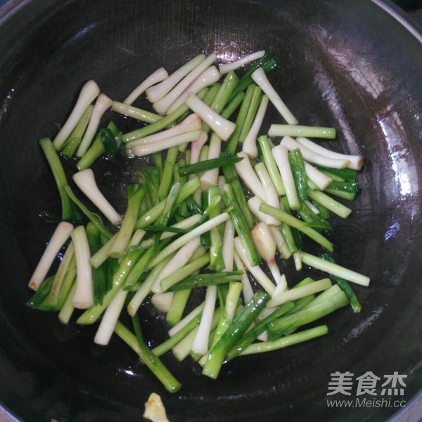 另起油鍋燒熱,放入蒜白,加少許鹽,料酒翻炒。