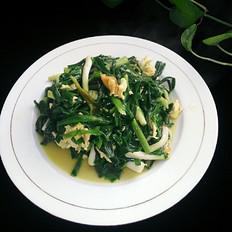 炒至變深綠,加少許雞精,加入炒雞蛋