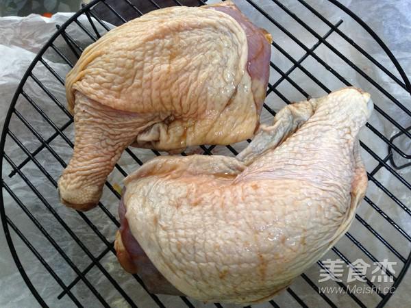 1.雞邊腿洗凈,用竹簽在雞肉上扎孔,盡量的多以便進味