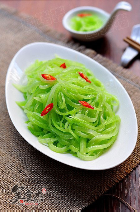 3.先斜切成大薄片,再切細絲;炒鍋里燒熱油,加入萵筍絲、鹽、雞精,用大火快速翻炒;直至萵筍絲變軟即可盛盤,最后用紅尖椒裝飾一下