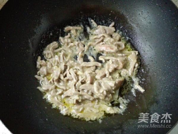 鍋中油燒至五成熱,下牛肉絲滑炒至全部變色撈出