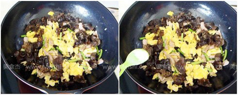 4.倒進少許生抽調味,放入木耳和蒜薹翻炒至熟