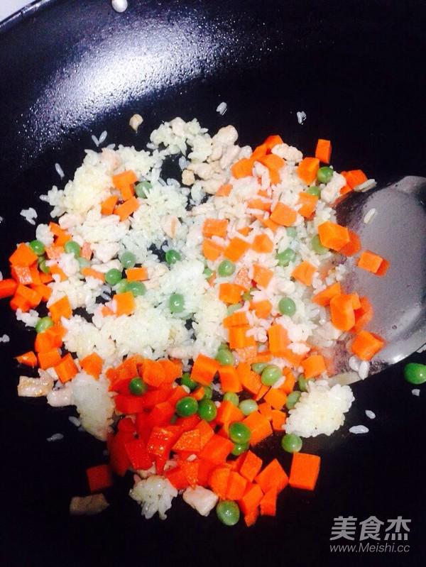 加入豌豆和胡蘿卜,炒至米飯熱透