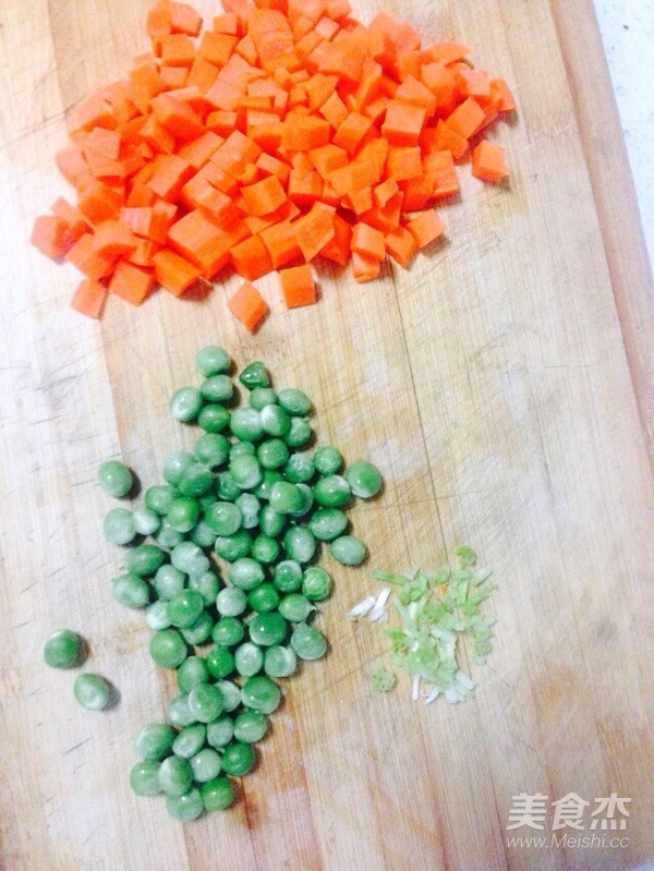 準(zhǔn)備食材,胡蘿卜去皮切小丁 ,蔥切末