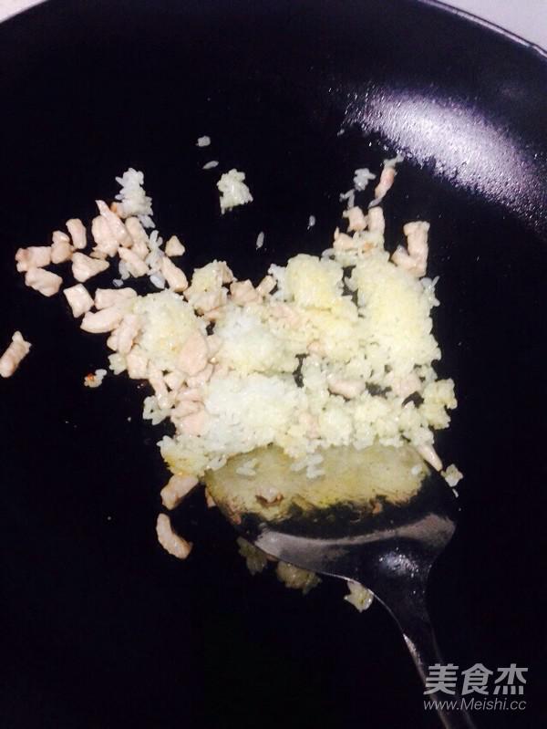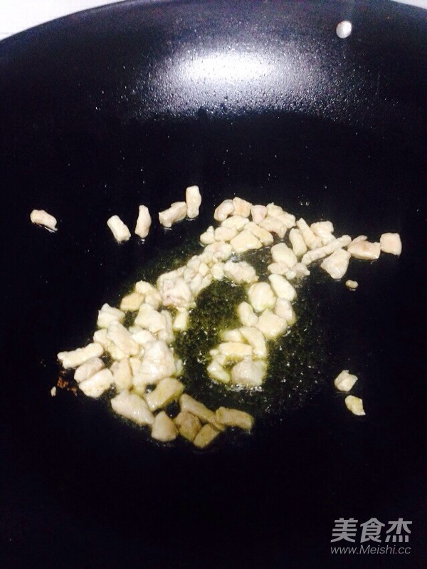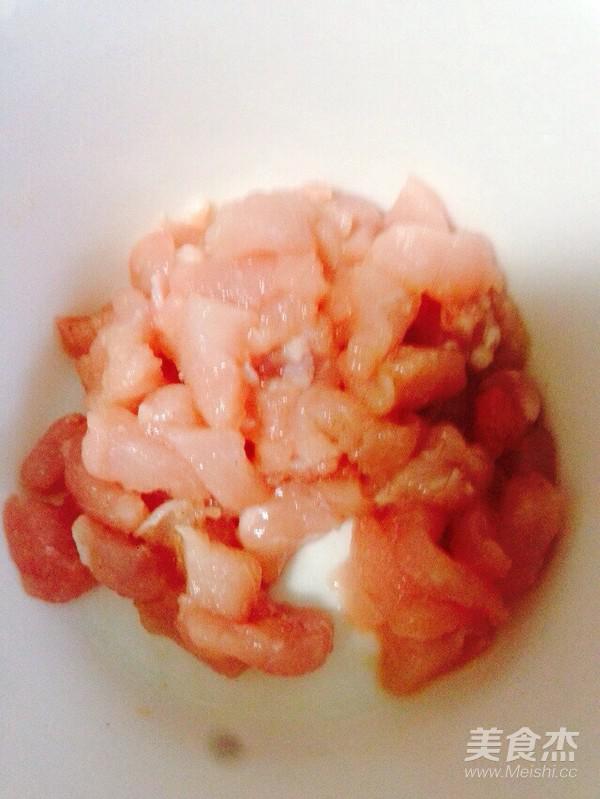 雞脯肉切小丁,放入料酒,白胡椒粉和食鹽拌勻,腌制10分鐘