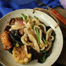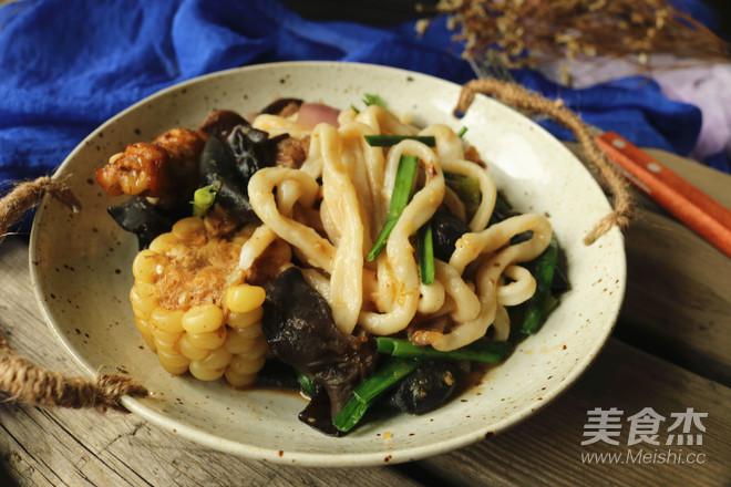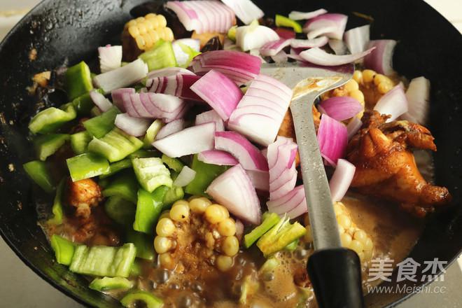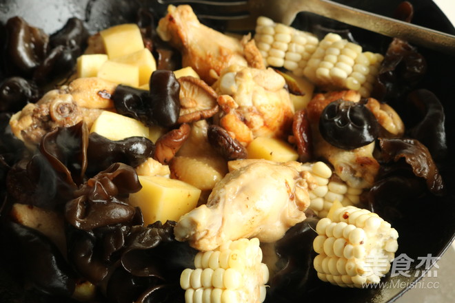 11.加入香菇、木耳、玉米和土豆翻炒。