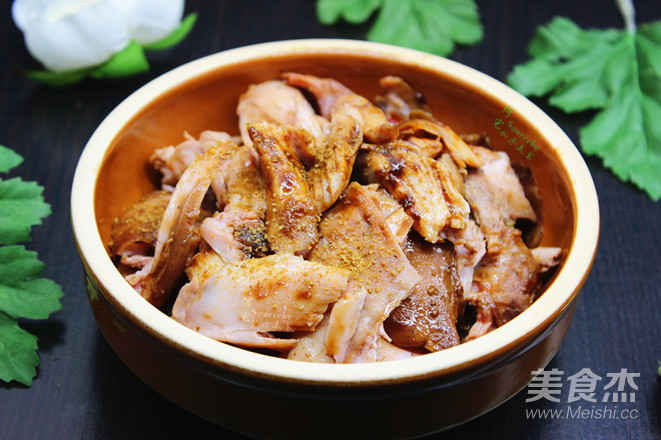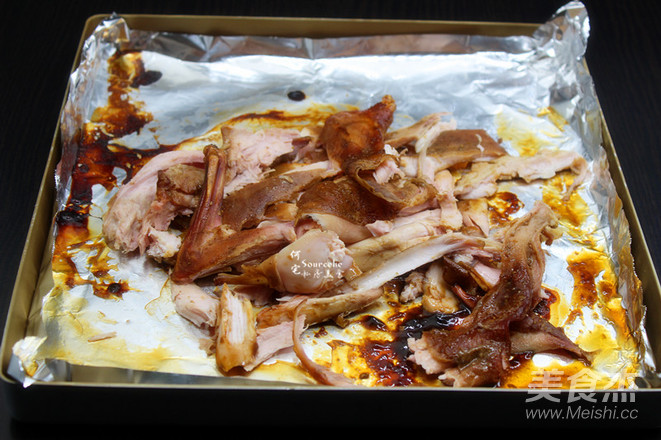手撕好兔肉,把烤盤上汁倒入拌均即可。