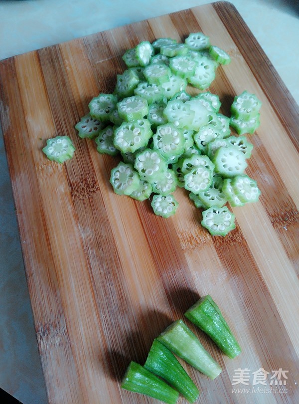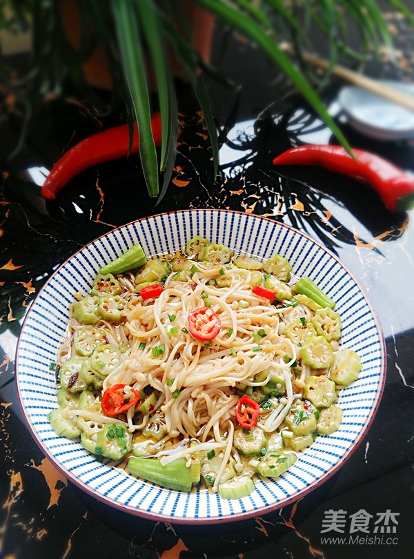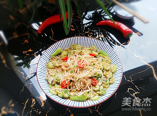 燒鍋開水,放入少許油鹽,放金針菇和秋葵下鍋煮兩分鐘,撈起