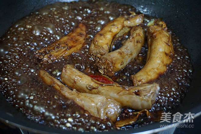 7.加入沒過鴨脖的沸水,大火煮沸后就轉(zhuǎn)中火,蓋蓋子燜煮到收汁。