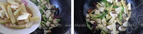 8.接著放入蘑菇、青椒繼續翻炒,將炸鍋的茭白和土豆條放入