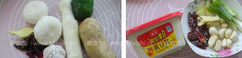 2.姜去皮切片,尖椒切寸斷,口蘑切小塊,茭白和土豆去皮分別切成小塊和條狀,青椒切粗絲