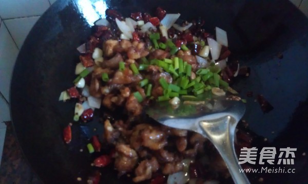 炒香后,這時才把事先炸過的雞丁和小蔥放入鍋內(nèi)翻炒