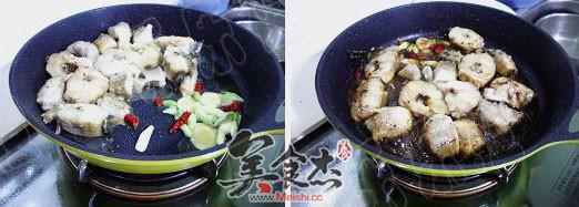 3.鱈魚兩面煎黃推入一邊,下入蔥、姜、干辣椒段