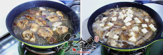 6.中火燒開,豆腐切成小塊下入鍋中燉至10—15分鐘加鹽調味兒即可關火出鍋