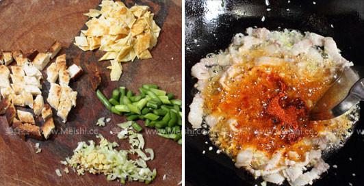 3.豆腐切1公分的片在油鍋里兩面煎黃,撈出切成丁,雞蛋打散,烙成蛋皮,在將蛋皮切成小塊,蒜苔斜切小丁,蔥姜切細末備用