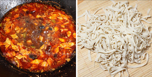 8.做面條:把堿和少許鹽放碗中,用涼水調勻后和面至光滑,然后用濕布蓋上餳三個小時左右最好,這樣出來的面比較有韌性,手工搟成面條或機器壓面條,放入開水中煮熟,撈出瀝干水分,加上臊子鹵拌均即可