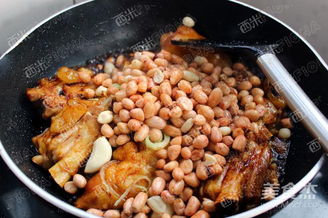 調入生抽,老抽,加蔥絲,蒜瓣,花生。