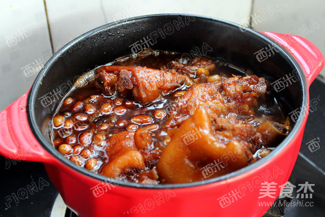 注入沒過食材的熱水。大火燒開,改用高壓鍋,上汽后12分鐘左右。冷卻后倒炒鍋把汁收濃。調適量鹽。(高壓鍋12分鐘左右,豬蹄吃起來有點勁道,所以不會覺得油膩。如果牙口不好的,還是燉爛點。但會稍稍容易膩)