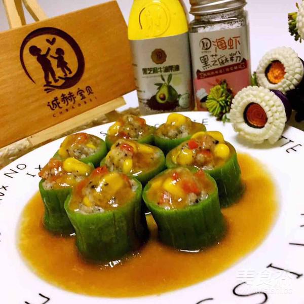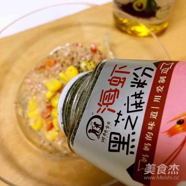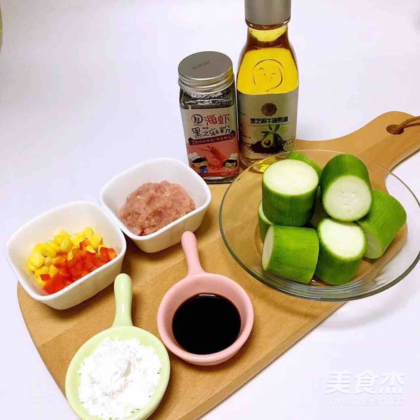 食材:絲瓜、豬肉泥、玉米粒、甜椒定、玉米淀粉、寶寶醬油、海蝦黑芝麻粉、黑芝麻牛油果油