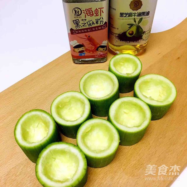 、絲瓜去掉最外面一層皮,切小段頂部用小勺子挖小洞