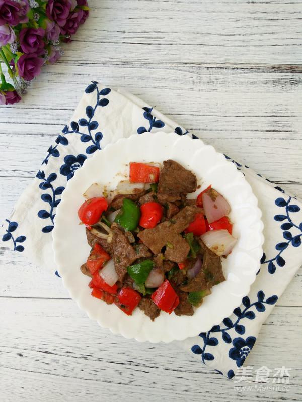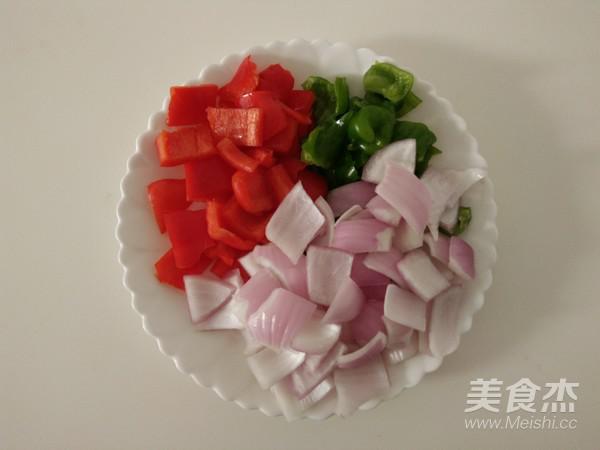 放入洋蔥、青紅椒塊炒熟,加鹽和雞精調(diào)味即可。