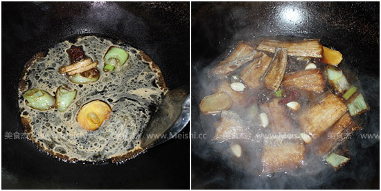 6.下黃酒、醬油、醋爆鍋出香氣,然后下水、鹽、白糖、胡椒粉等調料燒開