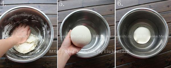 14.將發酵好的面團取出放在撒有一層薄粉的案板上,充分地揉壓出里面的空氣