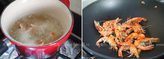 6.炒鍋燒熱,放入椒鹽炒香,再放入炸好的蒜蓉和青紅椒圈,倒入蝦,翻炒均勻即可出鍋